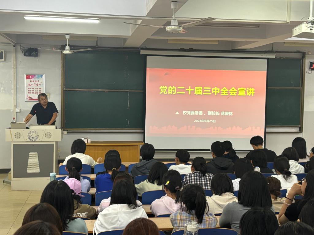 9月25日下午,校党委常委、副校长蒋爱林面向文法学院师生在开发区综合楼412教室集中宣讲党的二十届三中全会精神,人人综合网师生代表百余人听取了讲座报告。