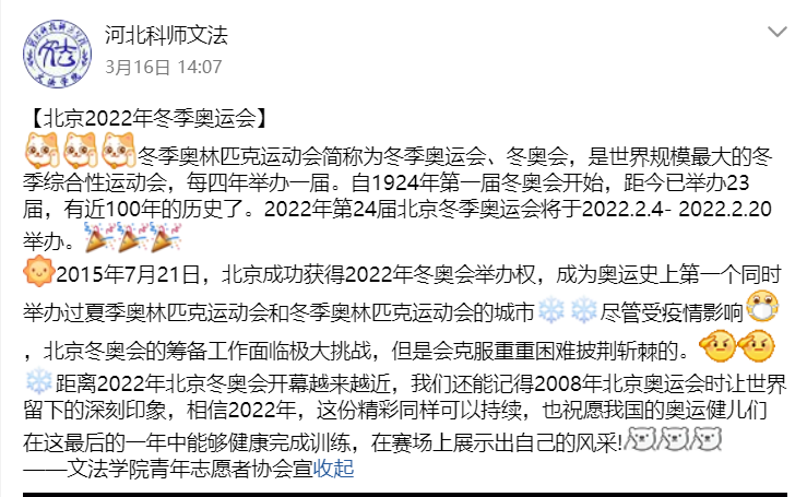 为深入贯彻落实习近平总书记关于筹办北京2022年冬奥会和冬残奥会重要指示精神,进一步在全校广大青年群体中推动冰雪运动普及,宣传冬奥文化,助力冬奥会筹办,弘扬奥林匹克精神,河北科技师范学院人人综合网青年志愿者协会于2021年3月16日举办以“普及运动知识,宣传冬奥文化”为主题的志愿服务活动。