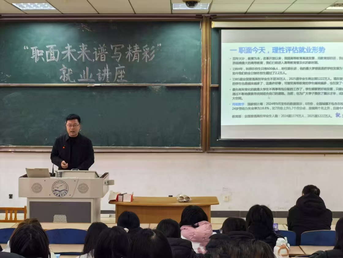 当前,随着高等教育的普及,毕业生数量逐年增加,就业市场竞争激烈,许多大学生在职业规划方面比较迷茫,对未来职业方向选择缺乏清晰思考。在此背景下,为了提升学生求职能力,拓展就业渠道,增强就业质量,2024年12月24日,我校面向全体学生举办了“职面未来,谱写精彩”就业讲座。