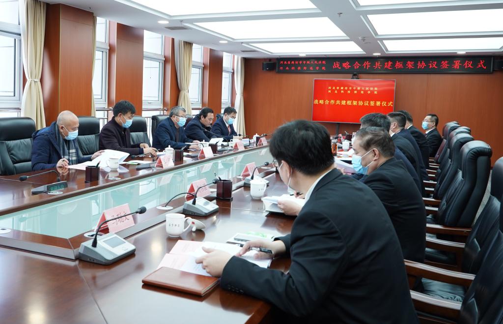 蒋爱林副校长代表河北科技师范学院对廊坊中院给予学院的关心、支持和帮助表示感谢,从学院发展历程、办学理念、学科建设、特色人才培养等方面介绍了有关情况。他表示双方应充分发挥各自资源优势,扩大交流合作领域,深化“政产学研用”协同发展,推动法治人才培养同频共振,提高研究实践成果转化,画出双方友好合作的最大同心圆。
