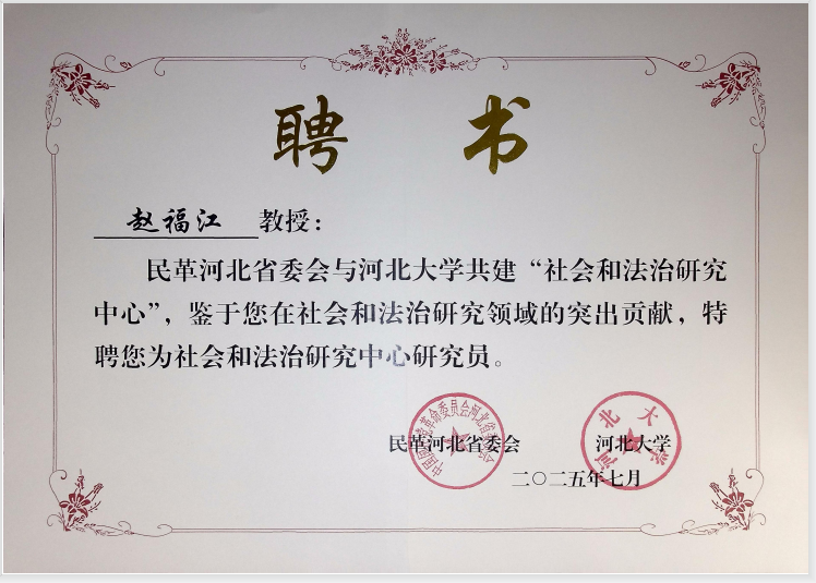河北科技师范学院人人综合网院长赵福江教授被聘为社会和法治研究中心研究员。