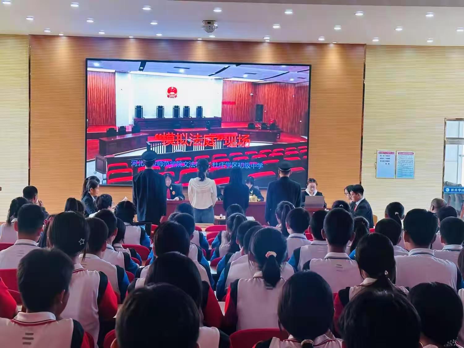 在杜庄中学,我校志愿者同学开展了关于未成年人刑事案件模拟法庭表演活动.真实的庭审过程,让现场观摩的师生和家长代表零距离体验和了解了法庭审理的程序,学习了相关的法律知识,深刻体会到法律的威严和神圣。王慧院长对涉及的法律问题进行深入讲解和分析,为杜庄中小学进行了相关答疑,得到了杜庄中小学同学、教师、家长的一致好评。同学们积极参与,认真学习法律知识,并表示一定在日常生活中学法、守法、用法。